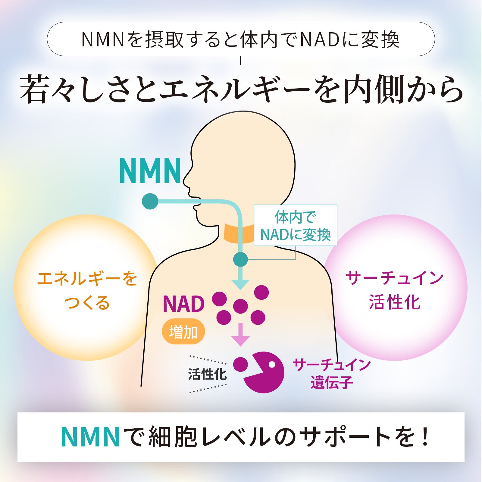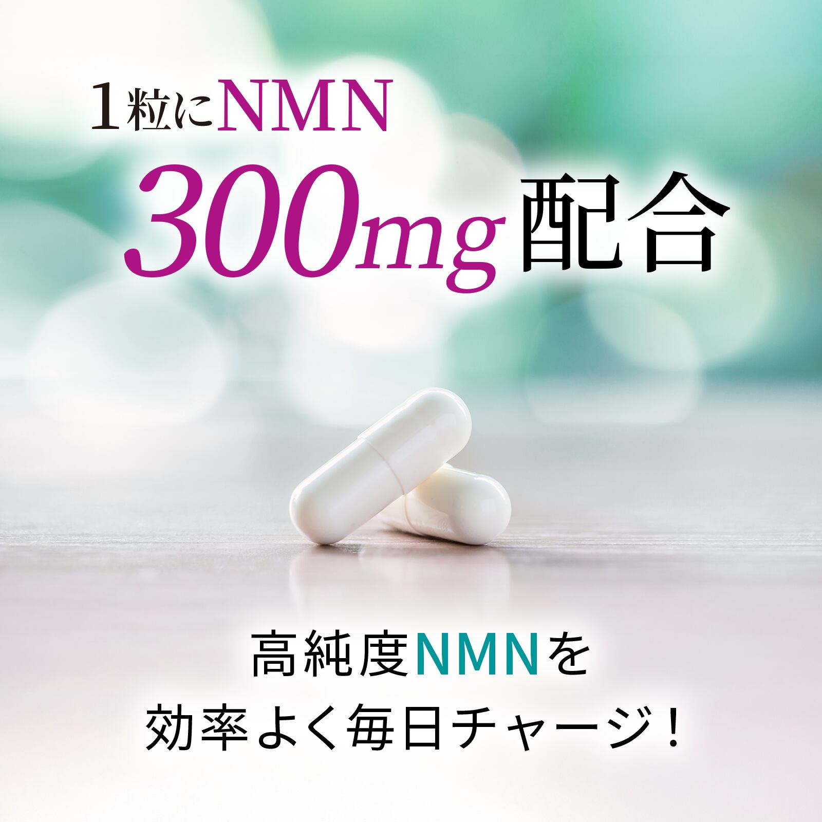 1粒に300mgのNMNを配合し、30日間で合計9000mgをしっかり補給。科学的に効果が証明されたNMN(β-ニコチンアミドモノヌクレオチド)の力を最大限に引き出し、日本製だからこそ、安心・安全な毎日のエイジングケアをお届けします。